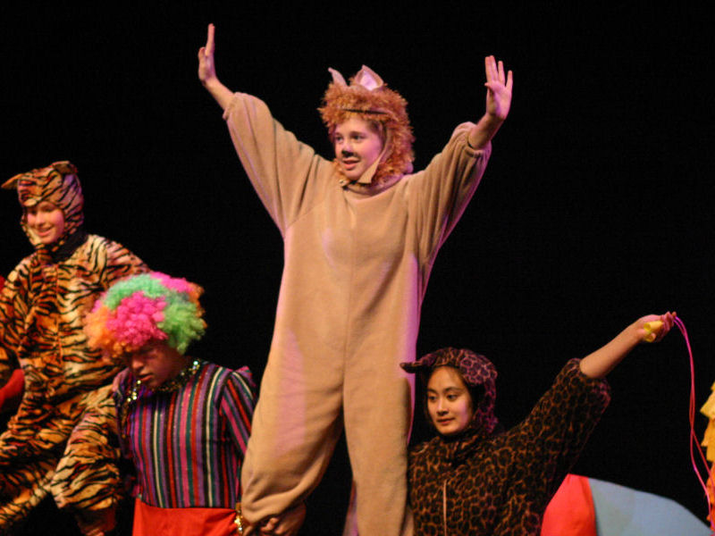 (above left) As opening night approaches, the company calls occur. Here the stage manager leads the cast in rousing cheers for a great show. After the show, the cast poses for candid photos and group shots. (above) Horton and Gertrude; (above right) the cast gets silly; (left) jungle denizens - that's Joyce in the zebra costume; (right) Gertrude and the Cat. |